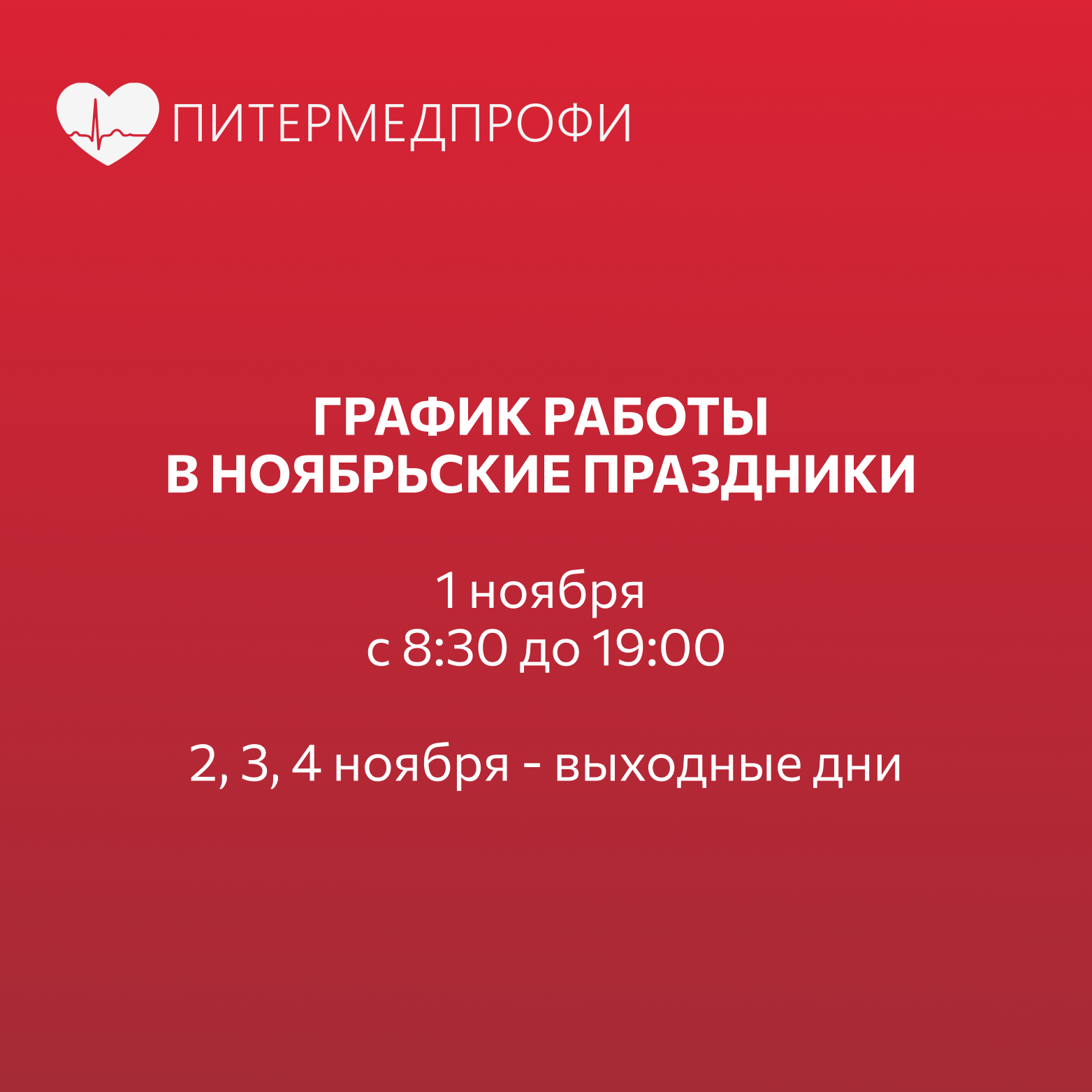 Информируем вас, что в связи с ноябрьскими праздниками, клиника ПИТЕРМЕДПРОФИ будет работать 1 ноября с 08:30 до 19:00. Процедурный кабинет будет открыт с 08:30 до 14:00.